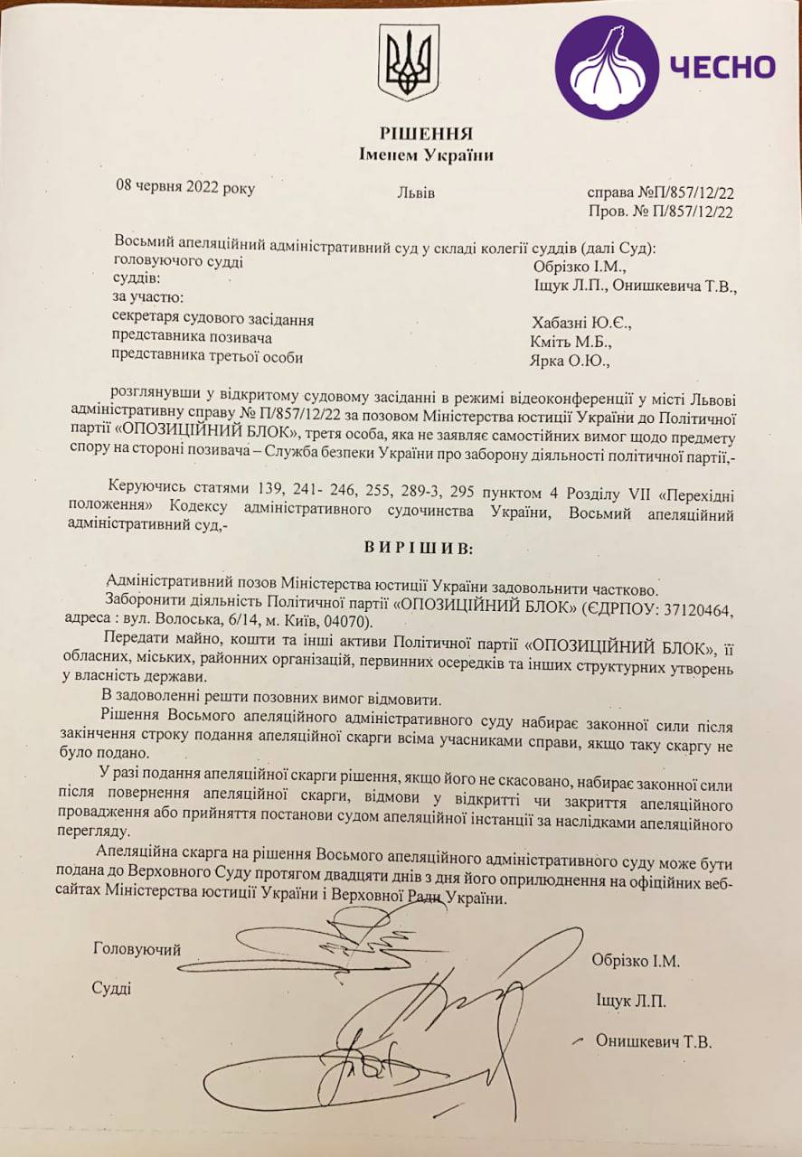 Восьмой апелляционный админсуд запретил партию "Оппозиционный блок". Имущество партии и всех ее ячеек, согласно решению суда, уходит государству.