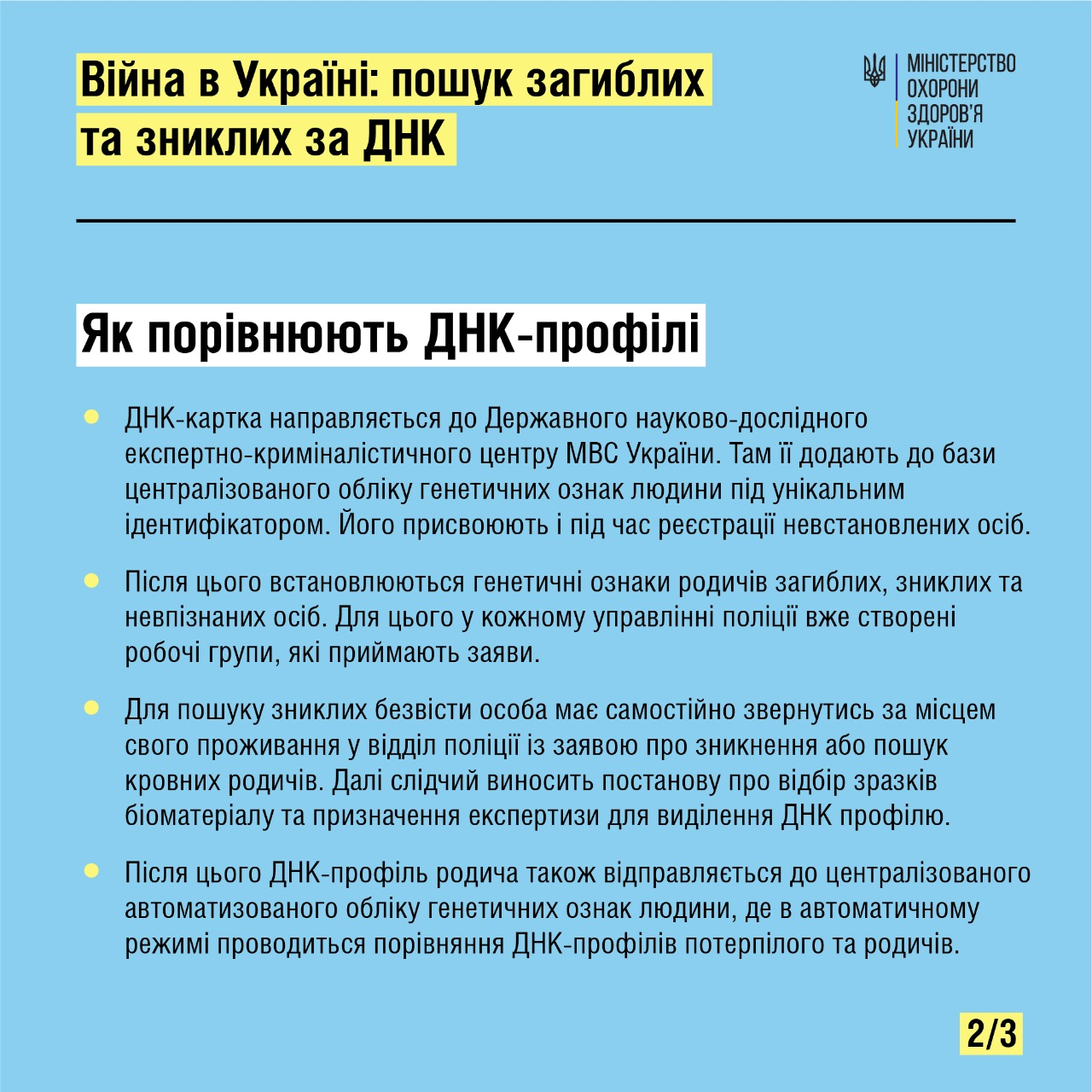 • ДНК-карта направляется в Государственный научно-исследовательский экспертно-криминалистический центр МВД Украины. Там ее добавляют в базу централизованного учета генетических признаков человека под уникальным идентификатором. Его присваивают и при регистрации неустановленных лиц. После этого устанавливаются генетические признаки родственников погибших, пропавших и неопознанных лиц. Для этого в каждом управлении полиции уже созданы рабочие группы, принимающие заявления.