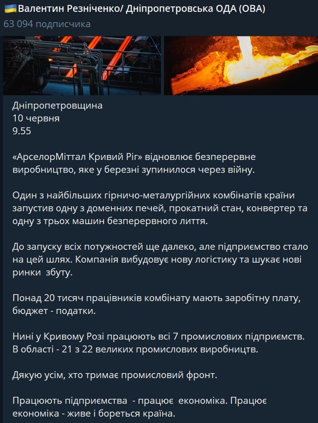 10:12 В Кривом Роге возобновляет работу крупнейший в Украине металлургический комбинат "Арселор Миттал", который ранее остановился из-за войны.