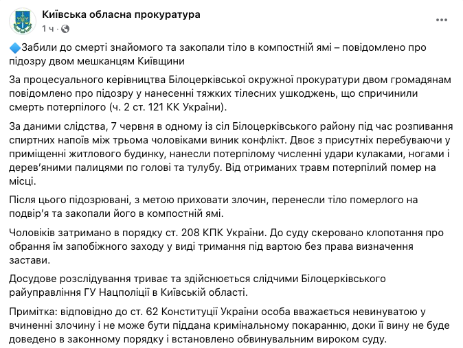 Несмотря на войну, в Украине никуда не делся обычный бытовой криминал. В Киевской области двое мужчин забили насмерть своего товарища во время алкогольного застолья.