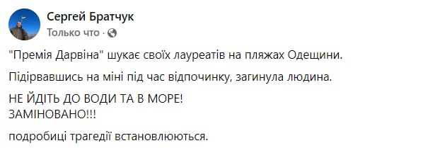 "Премия Дарвина" ищет своих лауреатов на пляжах Одесской области. Взорвавшись на мине во время отдыха, погиб человек", - написал Братчук.