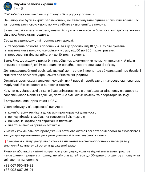 В Украине злоумышленники обманом выманивали деньги у родных и близких военнослужащих, рассказывая, что те попали в плен, и предлагая помощь за немаленькие деньги. СБУ задержала мошенников.
