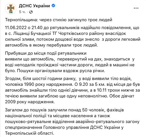 В селе Лещанцы Тернопольской области сильным ливнем снесло с дороги легковой автомобиль, погибли три человека.