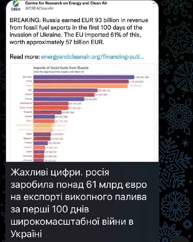 "Россия заработала 93 миллиарда евро дохода от экспорта ископаемого топлива за первые 100 дней после вторжения в Украину. ЕС импортировал 61% этого объема на сумму около 57 миллиардов евро" - говорится в сообщении.