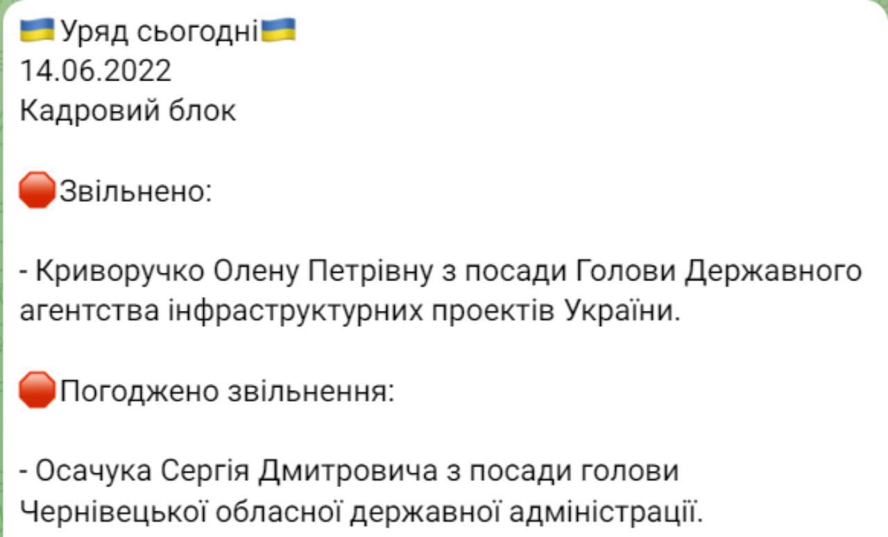 "Согласовано увольнение Осачука Сергея Дмитриевича с должности председателя Черновицкой областной государственной администрации", - написал он.