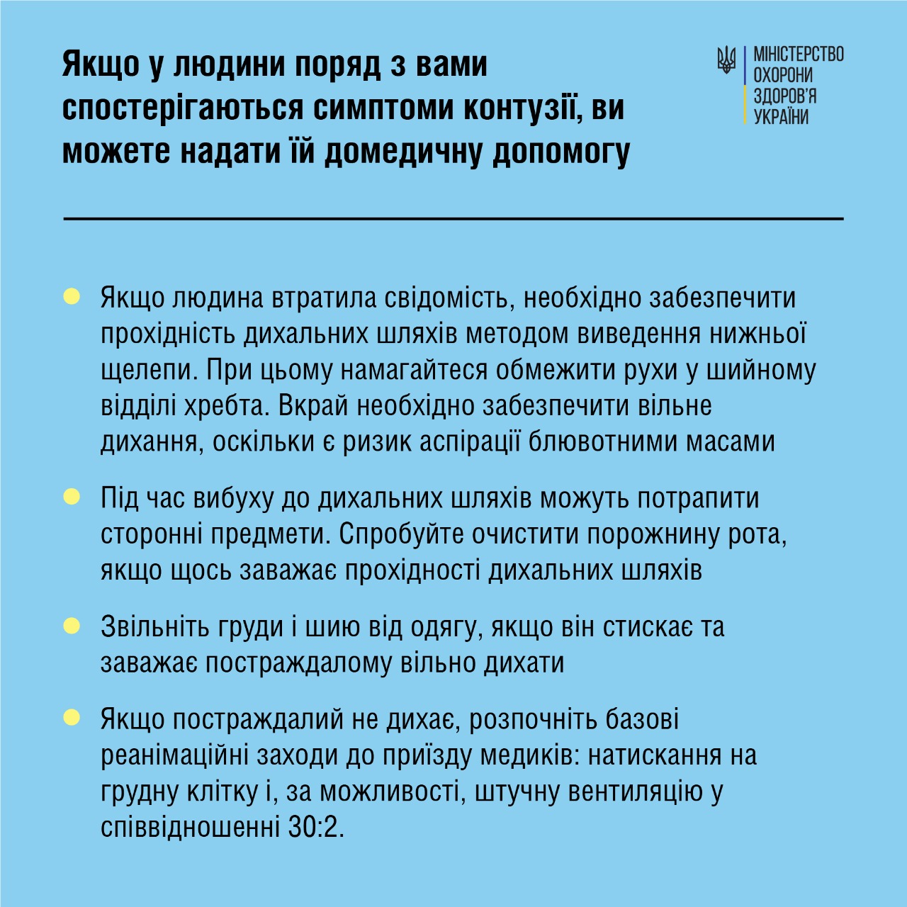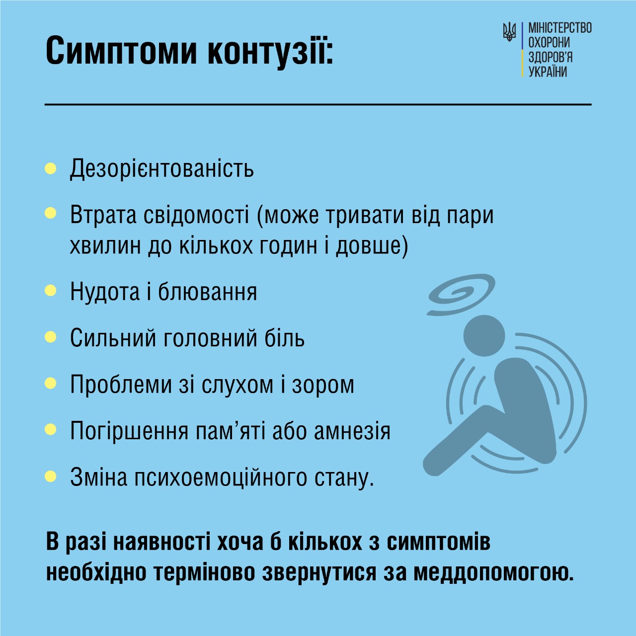 В инфографике Минздрава можно узнать об основных симптомах и опасности контузии, а также как оказать помощь человеку, у которого наблюдаются симптомы контузии.