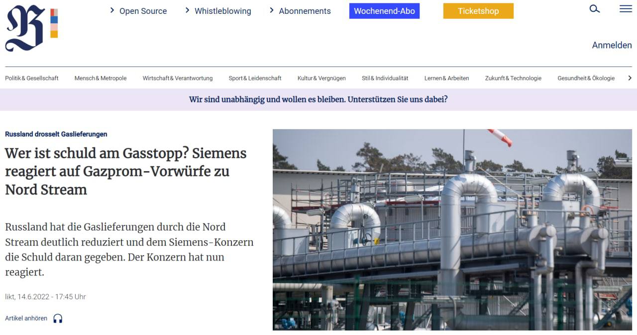 Немецкая компания Siemens подтвердила, что не может доставить газовую турбину для "Северного потока" из Канады после ремонта из-за санкций против РФ, пишет Berliner Zeitung.