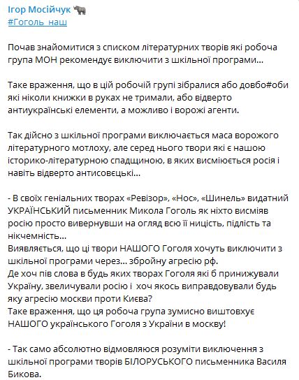 "Действительно из школьной программы исключается масса вражеского литературного хлама, но среди него произведения, которые являются нашим историко-литературным наследием, в которых высмеивается россия и даже откровенно антисоветские…" - написал Мосийчук.