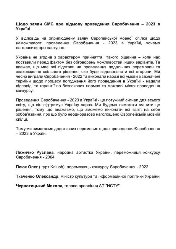 Ранее Европейский вещательный союз (EBU) решил, что "Евровидение" в 2023 году состоится не в Украине. Организаторы обратились к Великобритании, чтобы обсудить возможность проведения конкурса там (представитель этой страны занял на конкурсе второе место).