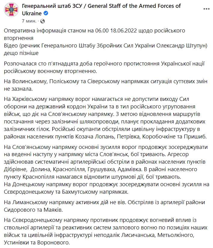Подробнее о том, как прошел 114-й день войны читайте в итогах за 17 июня.