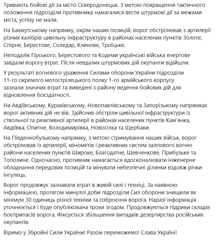 Бои под Северодонецком, Бахмутом и Славянском. Утренняя сводка Генштаба ВСУ