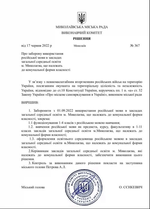 Согласно документу, в связи со вторжением войск РФ запрещается функционирование 1-4 классов с русским языком обучения.