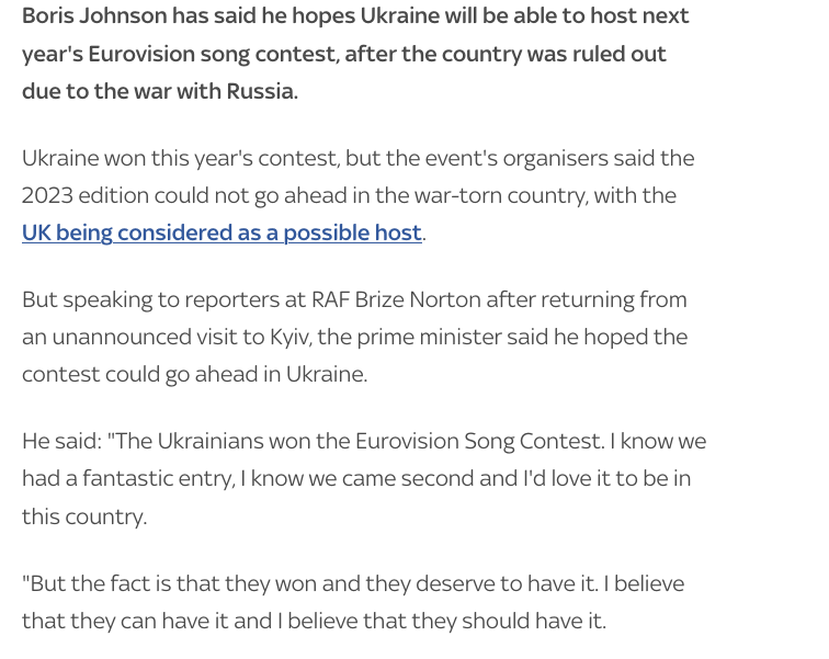 "Факт таков: Украина победила, и она заслуживает его проводить. Я считаю, что они могут провести конкурс, и верю, что они должны это сделать. По моему мнению, Киев или любой другой безопасный украинский город был бы фантастическим местом для Евровидения", — сказал Джонсон.