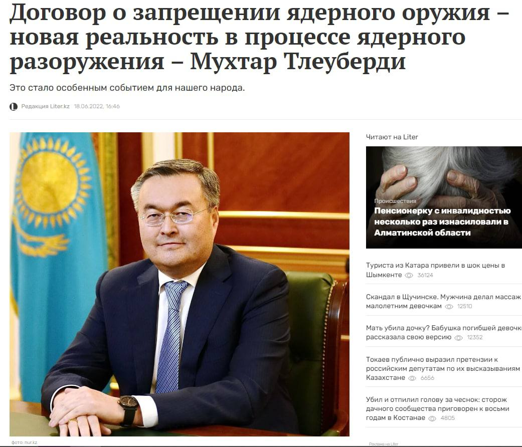 "Как отмечает генеральный секретарь ООН Антониу Гутерриш, сегодня, когда по всему миру рассредоточено около 13 400 ядерных боеголовок, возможность применения ядерного оружия стала реальней, чем в самые мрачные дни холодной войны. Нынешний военный конфликт на территории Украины, разговоры о возврате ядерных вооружений и взаимные угрозы применения ядерного оружия заставляют нас, как никогда прежде, задуматься о коллективной уязвимости человечества и о насущной необходимости запрета и ликвидации этого смертоносного оружия", - заявил Тлеуберди.