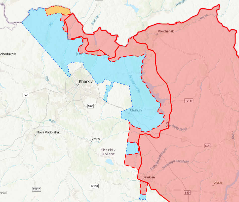 Российские телеграм-каналы пишут, что Рубежное уже захвачено, но украинский Генштаб, как видим, этого не подтверждает. Также россияне сообщали, что взяли под контроль Терновую около границы с Россией. На картах Института изучения войны Терновая уже в зоне российского контроля, а Рубежное нет.