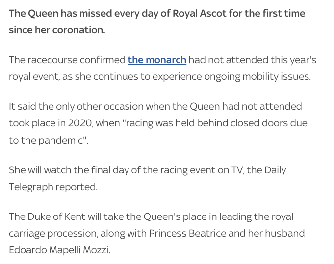 Королева Великобритании Елизавета II впервые за 70 лет своего пребывания на троне не посетила скачки в Аскоте - одно из важнейших светских мероприятий, которое проходит с 1711 года. Причиной стали проблемы со здоровьем.