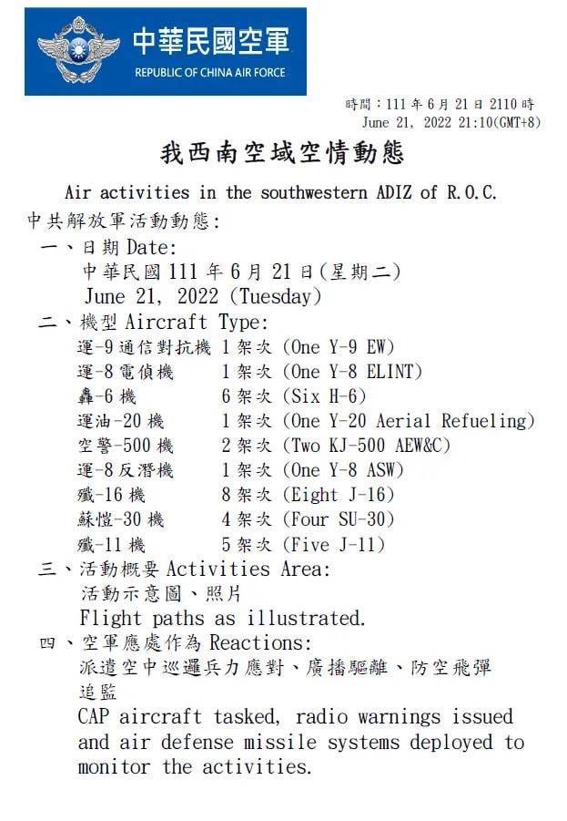 "29 самолетов НОАК типа Y-9 EW1, Y-8 ELINT1, H-66, Y-20 для дозаправки в воздухе 1, KJ-500 AEW&C2, Y-8 ASW1, J-168, SU-304 и J-115 вошли в юго-западную зону действия ПВО Тайваня 21 июня 2022", - говорится в заявлении Министерства национальной обороны острова.