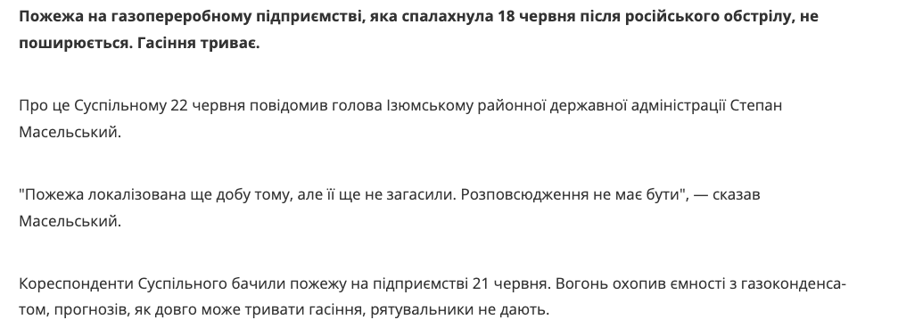 Пожар начался еще в субботу, 18 июня, после обстрела российскими войсками.