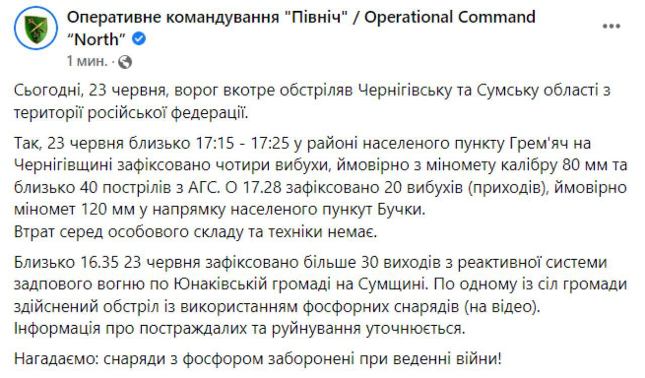 По данным командования, обстрел шел с территории РФ. Зафиксированы взрывы в районе Гремяча и Бучки (Черниговская область) и в Юнаковской общине Сумской области.