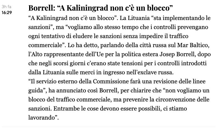 При этом верховный представитель Евросоюза Жозеп Боррель заявил, что ЕС не желает устраивать блокаду анклава, а лишь хочет выполнения антироссийских санкций, передает Il Fatto Quotidiano.