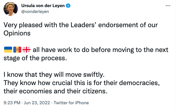 "Очень приятно, что лидеры поддержали наши мнения. Украине, Молдове и Грузии есть над чем поработать, прежде чем перейти к следующему этапу процесса. Я знаю, что они будут двигаться быстро. Они знают, насколько это важно для их демократии, их экономики и их граждан", - написала фон дер Ляйен в Twitter.