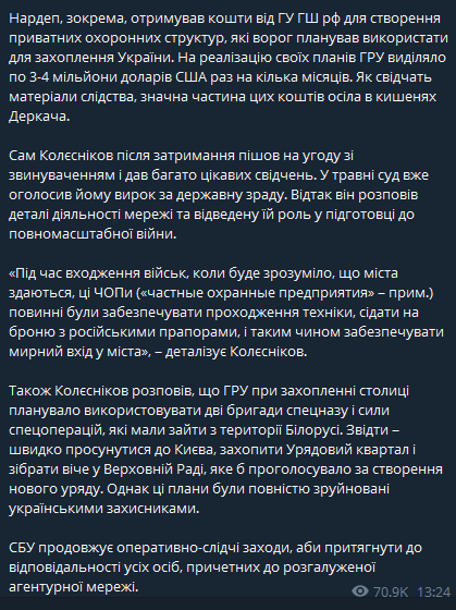 По словам Колесникова, ЧОПы Деркача должны были входить с войсками РФ в города. В случае захвата столицы силы ГРУ планировали устроить Вече в центре Киева и выбрать новое правительство.