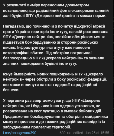 "В очередной раз обращаем внимание, что ЯПУ "Источник нейтронов", как и любая другая ядерная установка, не рассчитана на эксплуатацию в условиях боевых действий. Продолжение бомбардировки и обстрелов площадки могут привести к тяжелым радиационным последствиям с загрязнением прилегающих территорий", - говорится в сообщении.