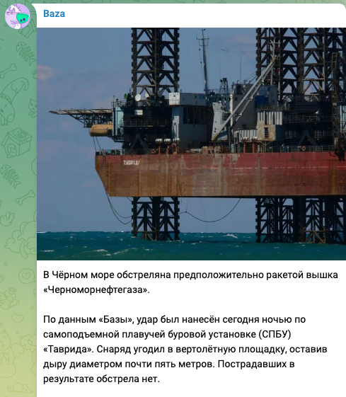 По данным телеграм-канала Baza, удар произошел ночью и пришелся на вертолетную площадку буровой "Таврида".