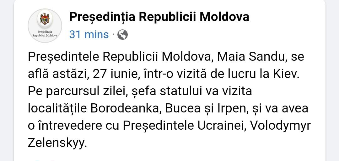 "Президент Республики Молдова Майя Санду сегодня, 27 июня, находится с рабочим визитом в Киеве. В течение дня глава государства посетит Бородянку, Бучу и Ирпень, встретится с президентом Украины Владимиром Зеленским", - говорится в сообщении.