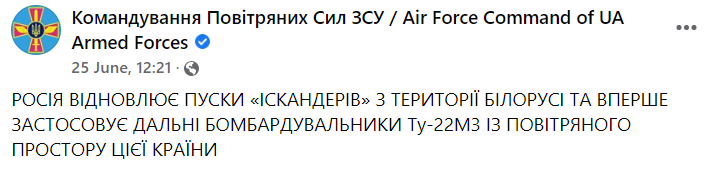 Командование Воздушных сил Украины заявляет, что Ту-22М3 залетали непосредственно в пространство Беларуси для стрельбы. Также утверждается, что с ее территории были пуски "Искандеров" по Украине (оперативно-тактический комплекс, пришел в России на смену "Точке-У").
