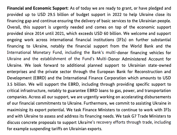 Также G7 обещает оказывать поддержку украинским государственным предприятиям и частному сектору в размере 3,5 млрд долларов через Европейский банк реконструкции и развития и Международную финансовую корпорацию.