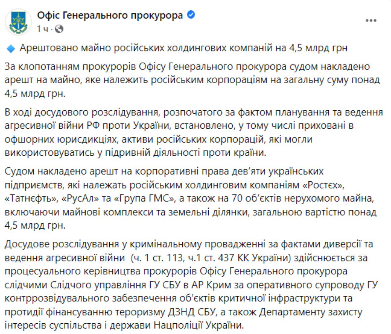 Судом наложен арест на корпоративные права девяти украинских предприятий, принадлежащих российским холдинговым компаниям "Ростех", "Татнефть", "РусАл" и "Группа ГМС", а также на 70 объектов недвижимого имущества, включая имущественные комплексы и земельные участки , общей стоимостью более 4,5 млрд. грн.