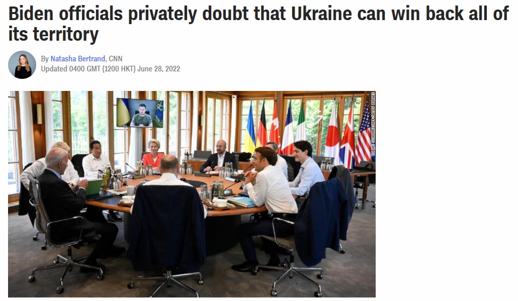 Как сегодня сообщило CNN, "советники президента Джо Байдена начали внутреннюю дискуссию о том, должен ли президент Украины Владимир Зеленский изменить свое определение украинской "победы" с поправкой на возможность необратимого сокращения его страны".