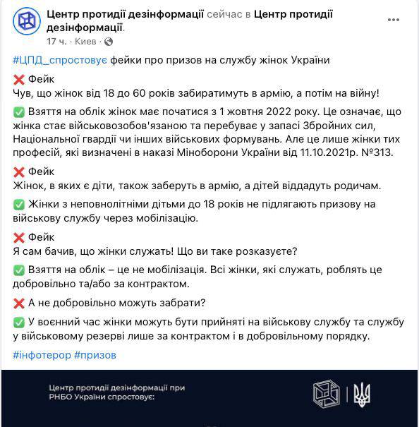 Принудительная мобилизация женщин в украинскую армию – это фейк, заявил Центр противодействия дезинформации при СНБО в своем Telegram-канале.