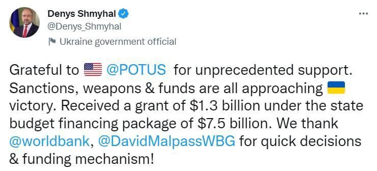 "Спасибо Белому дому за беспрецедентную поддержку. Санкции, оружие и финансы приближают победу Украины. Только что получили грант $1,3 млрд в рамках пакета финансирования госбюджета $7,5 млрд", - написал Шмыгаль.