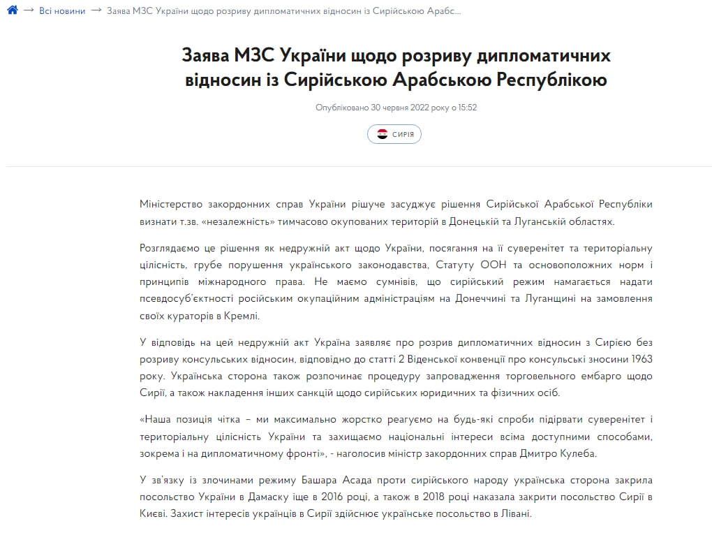 "Украина заявляет о разрыве дипломатических отношений с Сирией без разрыва консульских отношений в соответствии со статьей 2 Венской конвенции о консульских отношениях 1963 года. Украинская сторона также начинает процедуру введения торгового эмбарго в отношении Сирии, а также наложения других санкций в отношении сирийских юридических и физических лиц", - сказано в заявлении МИД.