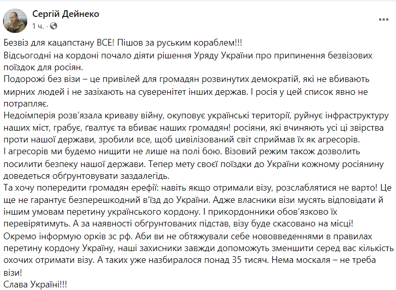 "С сегодняшнего дня (с 1 июля - Ред.) на границе начало действовать решение правительства о прекращении безвизовых поездок для россиян", - написал он.