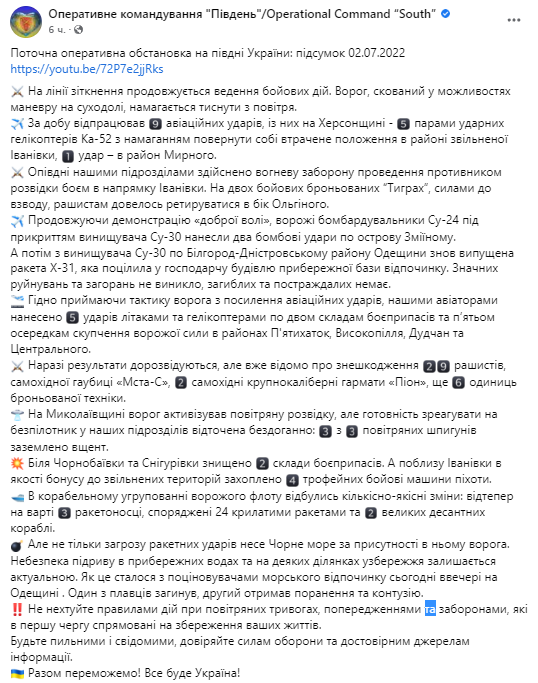 Отмечается, что за сутки враг отработал 9️ авиационных ударов, из них пять в Херсонской области парами ударных вертолетов Ка-52 с попыткой вернуть утраченное положение в районе освобожденной Ивановки, а также один удар в район Мирного.