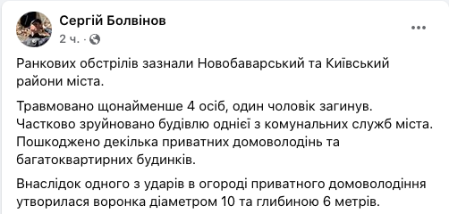 Стало известно о смерти одного человека в результате утреннего обстрела Киевского и Новобаварского районов Харькова. Еще четверо мирных жителей получили ранения.