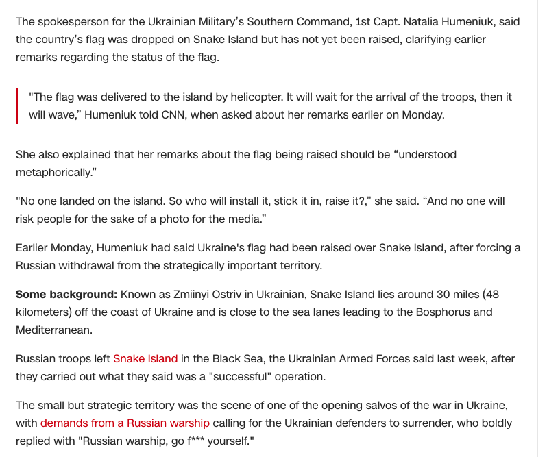 Пресс-секретарь Оперативного командования "Юг" Наталья Гуменюк уточнила свои слова о поднятом флаге Украины над островом Змеиный. Она говорит, что ее слова о поднятом флаге следует "понять метафорически", а опубликованное фото - старое.