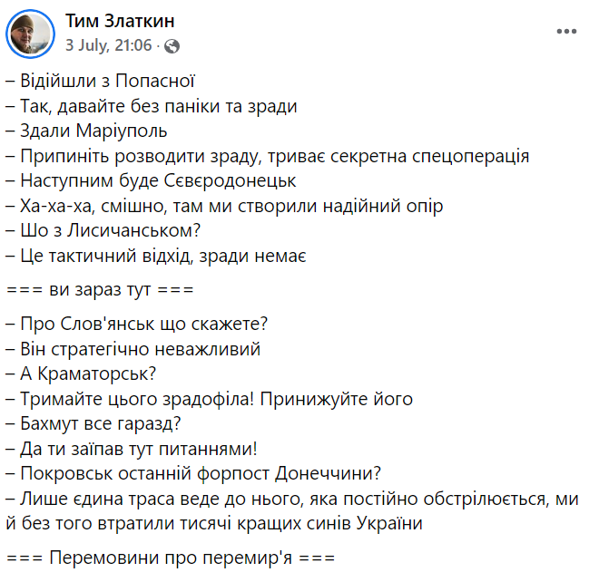 Волонтер Тим Златкин написал пост на тему того, что власти пытаются оправдать любое отступление и потерю города, превращая его в "перемогу". Таким образом, по его мнению, вообще могут потерять весь Донбасс и начать переговоры о перемирии.
