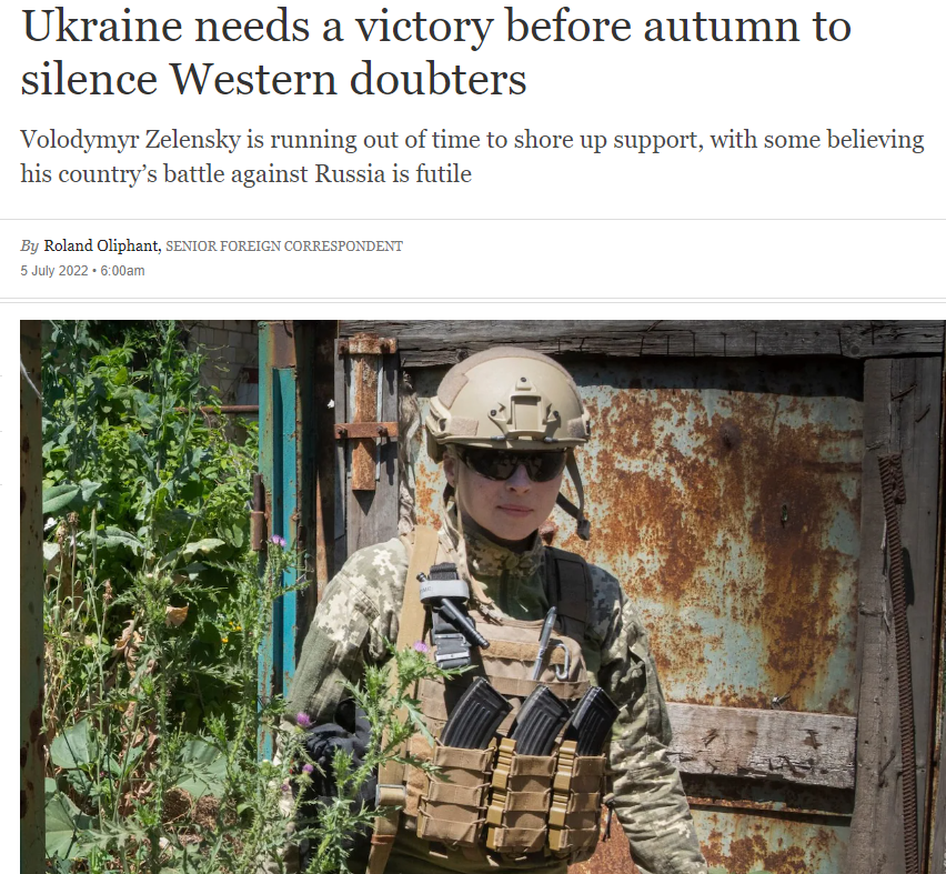 Кстати, не исключено, что от успеха этого предприятия будет зависеть уровень западной поддержки Украины. По крайней мере, такие намеки содержатся в статье британской газеты The Telegraph "Украине нужна победа до осени, чтобы сомнения на Западе умолкли".