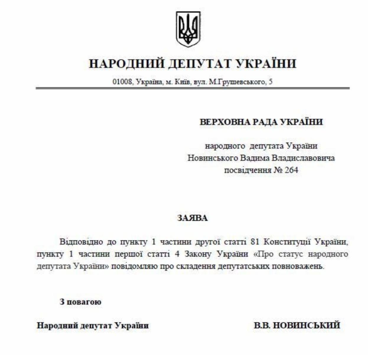 Вадим Новинский сложил полномочия народного депутата