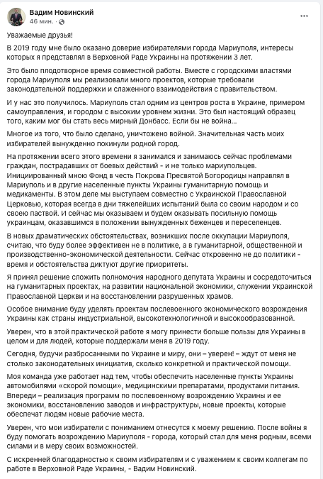 "Я принял решение сложить полномочия народного депутата Украины и сосредоточиться на гуманитарных проектах, на развитии национальной экономики, служении Украинской православной церкви и на восстановлении разрушенных храмов", - написал нардеп и опубликовал соответствующее заявление.