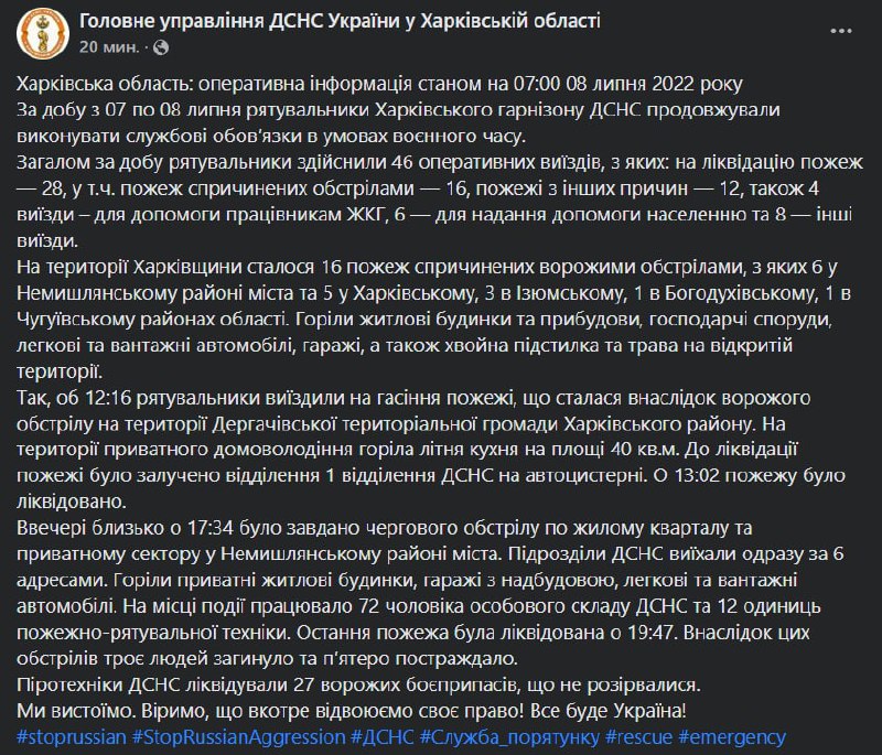В Харьковской области 7 июля от российских обстрелов произошло 16 пожаров. Наибольшее количество возгораний – в Немышлянском районе Харькова.
