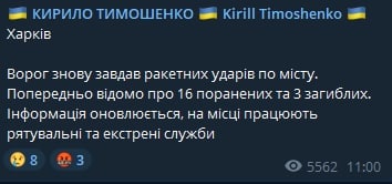 11.15 В Харькове из-за ракетных ударов погибли трое человек, ранены 16.