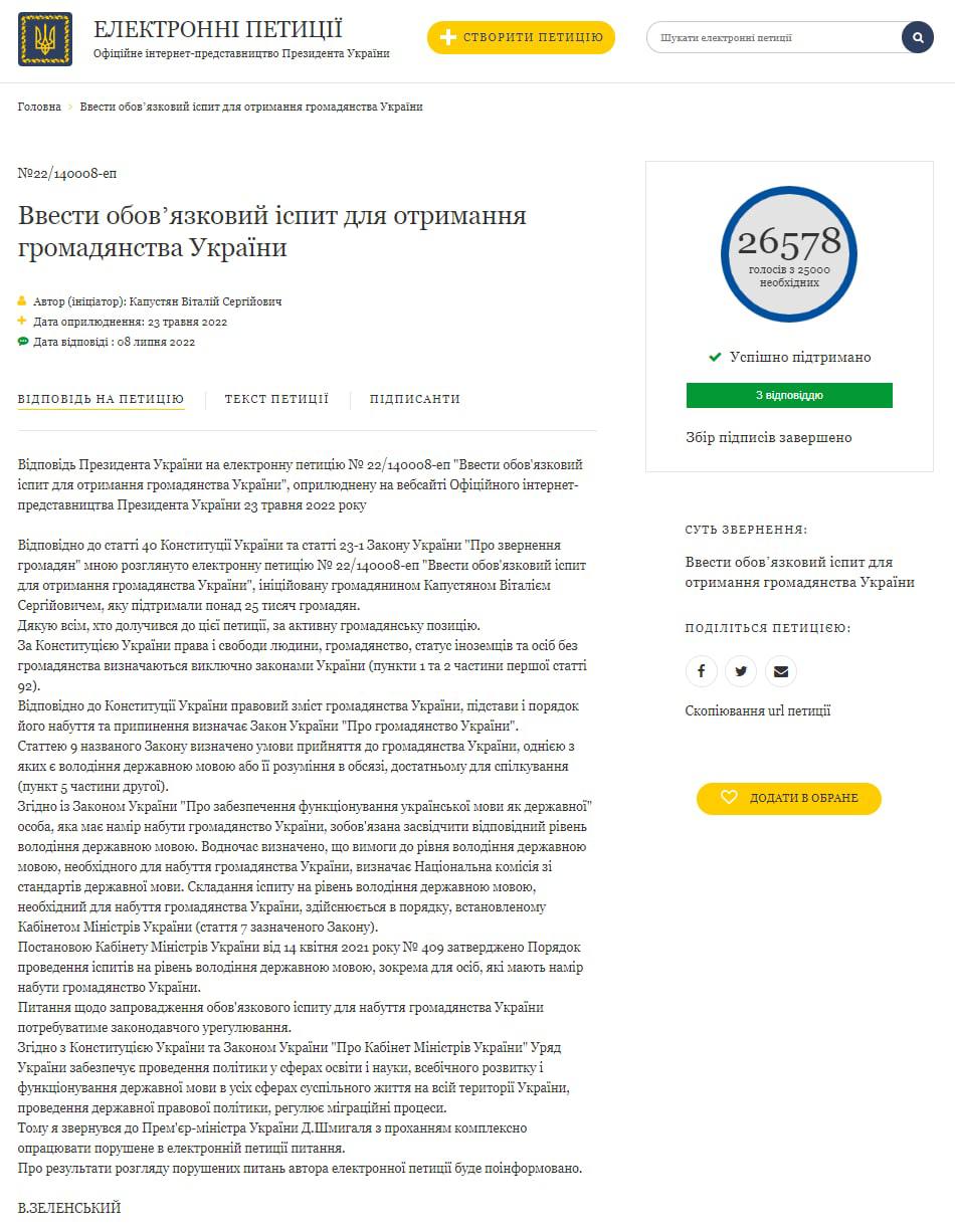 Так президент отреагировал на петицию о введении обязательного экзамена для получения гражданства Украины, которую подписали более 25 тысяч человек.