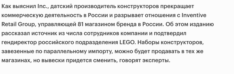 Об этом заявил гендиректор российского подразделения Lego Евгений Чихачев в комментарии изданию Inc.