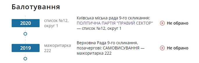 А уже в следующем, 2020-ом, он баллотировался в Киевский городской совет от "Правого сектора", но также не был избран.