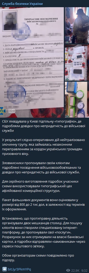 А также, что в Киеве мужчина за $1,5 тысячи продавал военнообязанным мужчинам поддельные справки для выезда за границу.